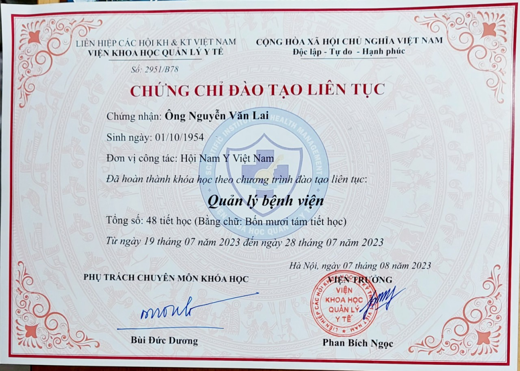 Lương y Nguyễn Văn Lai nhận chứng chỉ đào tạo liên tục Quản lý bệnh viện do Liên hiệp các hội KH & KT Việt Nam – Viện Khoa học Quản lý Y tế cấp