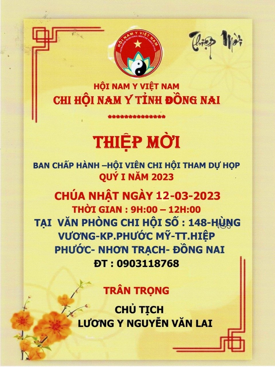 Thư mời Ban chấp hành – hội viên chi hội Nam Y Đồng Nai tham dự họp Quí 1 năm 2023