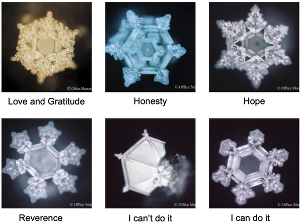 Tiến sỹ Masaru Emoto là nhà nghiên cứu về nước nổi tiếng người Nhật. Ông đã được đại học mở quốc tế chứng nhận là bác sỹ theo phương pháp y học thay thế. Ông đã dùng kỹ thuật chụp ảnh tốc độ cao để chụp tinh thể nước và chứng minh rằng sự hình thành tinh thể nước phụ thuộc vào suy nghĩ tích cực và tiêu cực của con người. Ông chứng minh rằng tất cả các mẫu nước có hình lục giác đều là nước tinh khiết nhất và nếu được gửi vào thông điệp của tình yêu thương và cảm ơn thì nước sẽ tăng hệ miễn dịch.